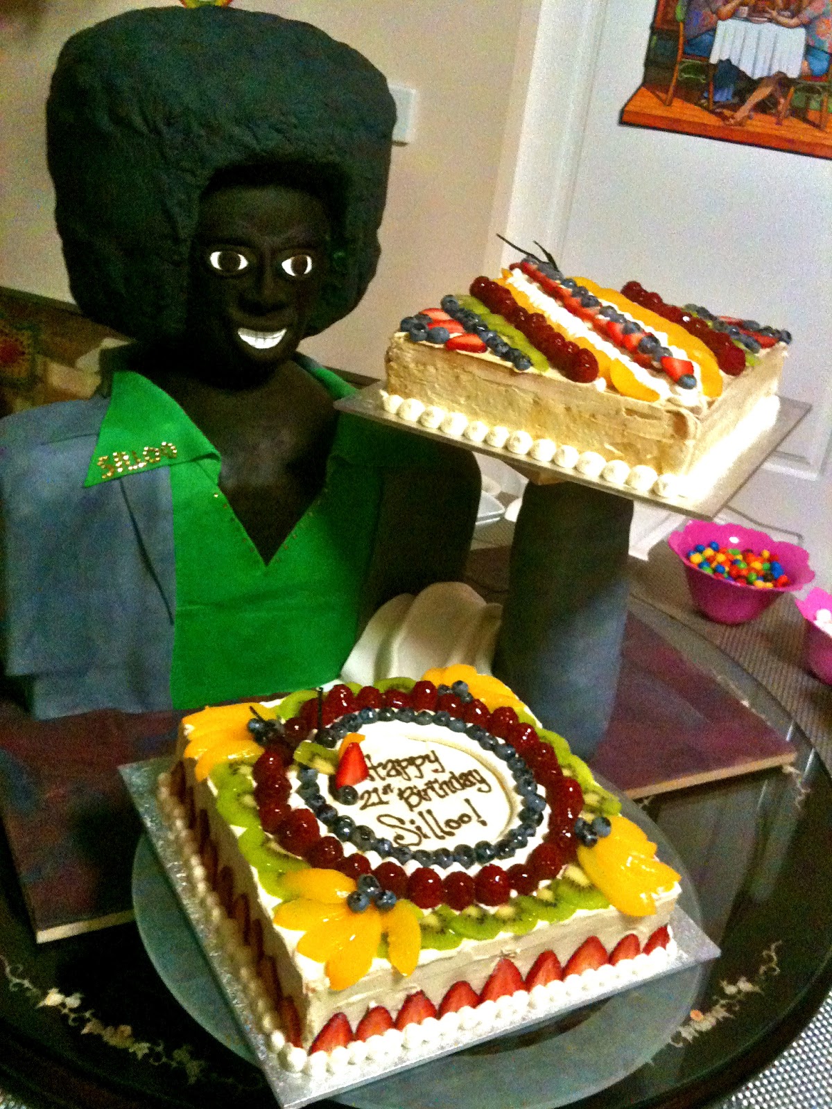The girls were happy to have been invited to the Carnival Buffet we held with Megan in Stage 3. The cake that stood out the most for her was the Baileys Flan Cake. The cake was a cloudy and moist Tia Maria Sponge base with Baileys cream flan on top lavished with silky crème chantilly and fresh fruits, it was a perfect epitome of "heaven in a cake". Something about it just stuck to Charlie and was somewhat of an unforgettable experience. So as she tried it, had it and loved it - she asked for it to be her birthday cake for her 21st this year. She also asked for a sugar daddy Afro man made out of fondant for her birthday, so teaming up with Kimmy who made the sculpture... we gave Charlie the biggest surprise of her life!